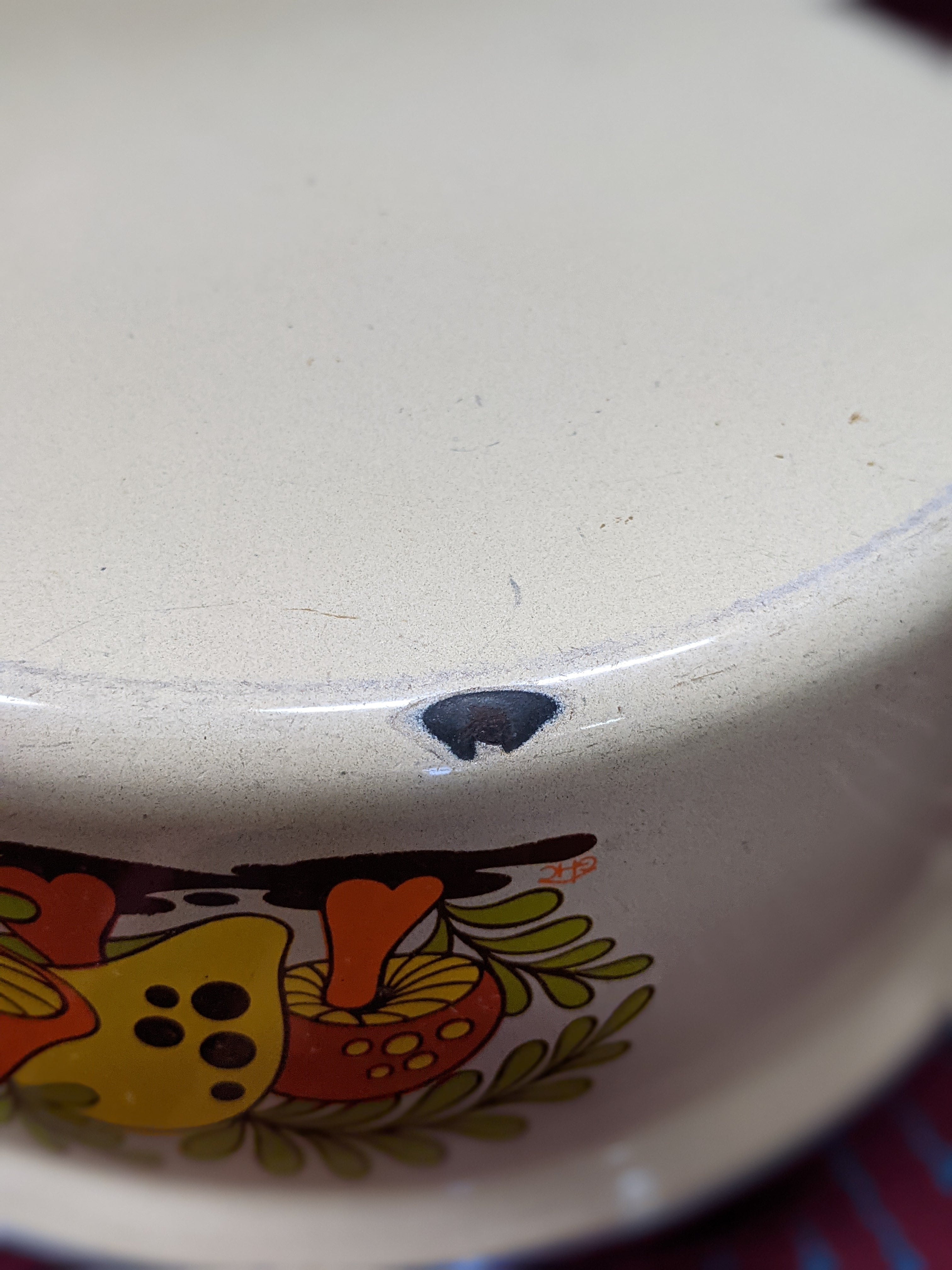 小さな傷箇所、細かな汚れ程度見られます。底部のホーローのかけ箇所があります。