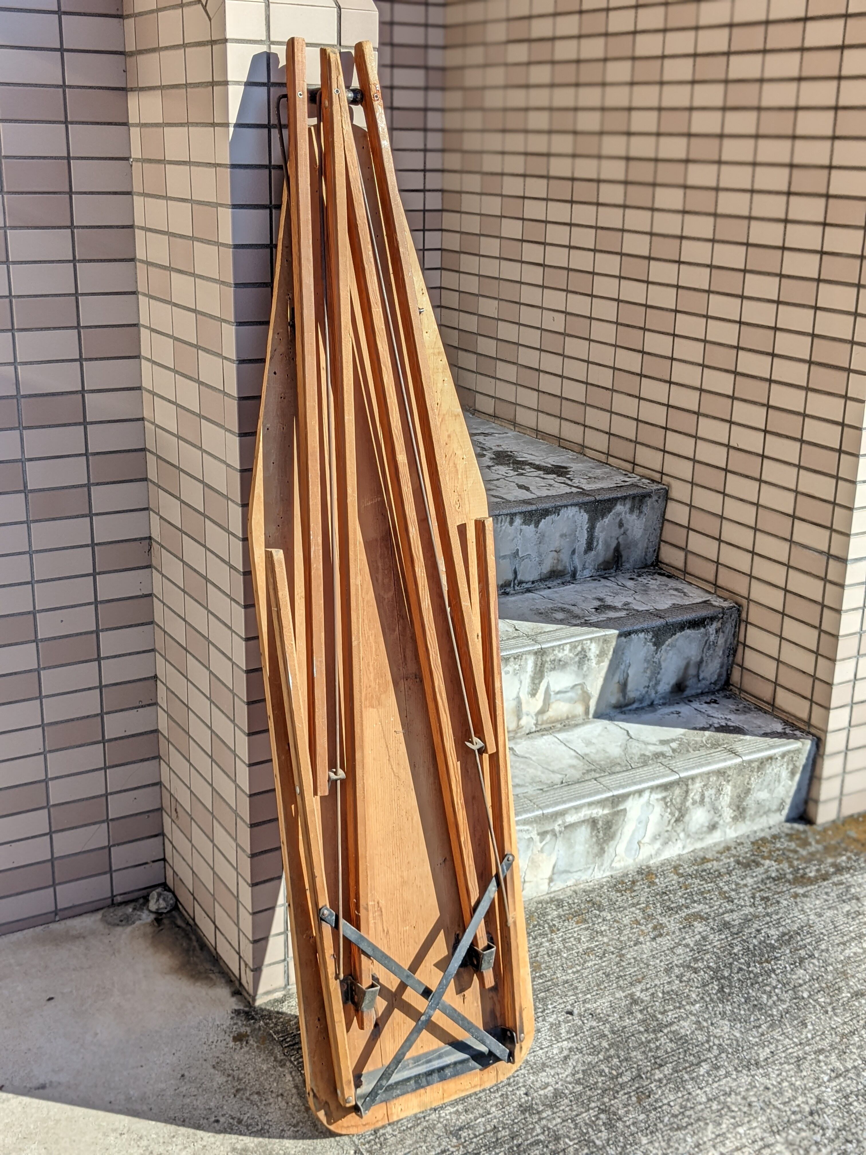 古い木製の折り畳みアイロン台で、見た目の雰囲気も抜群で、