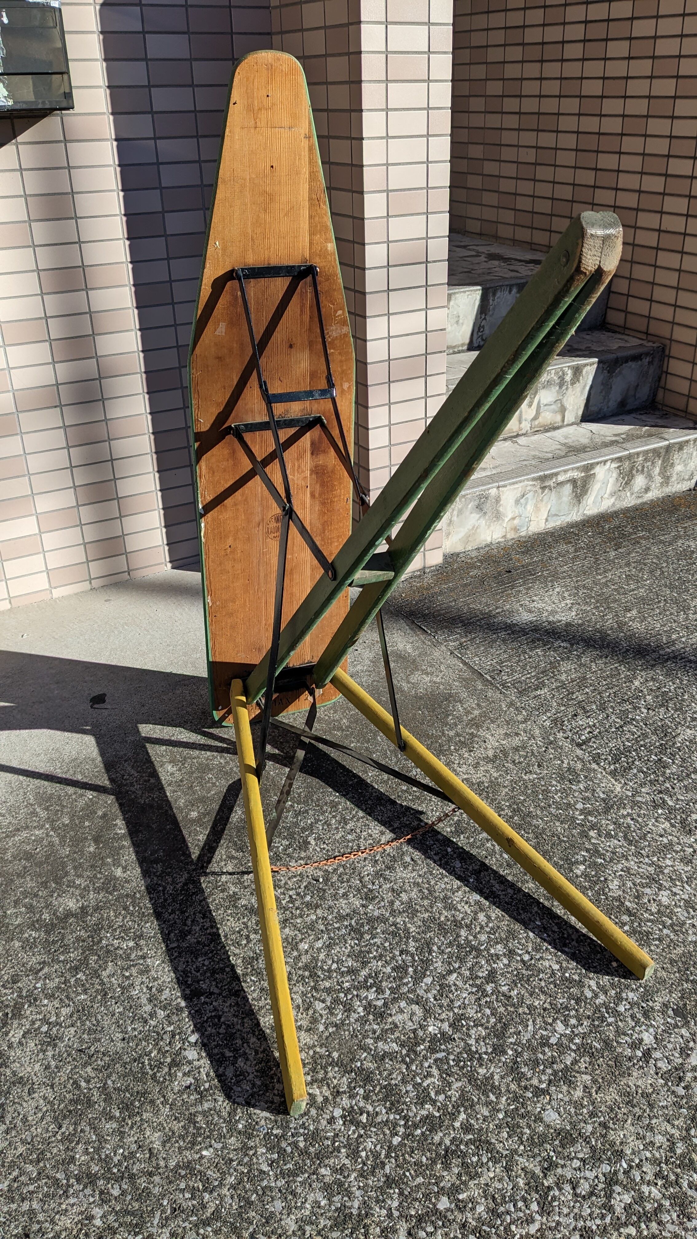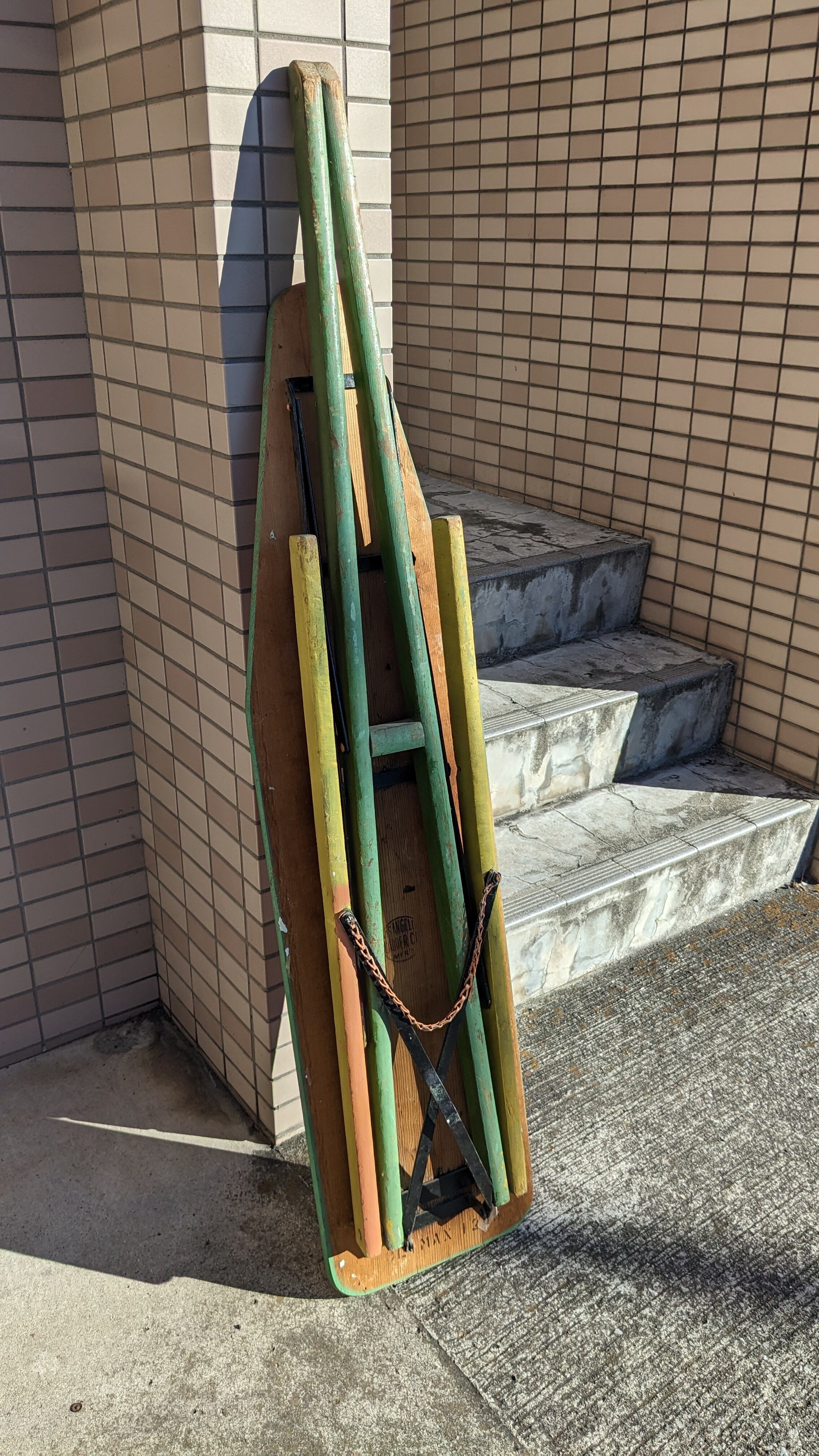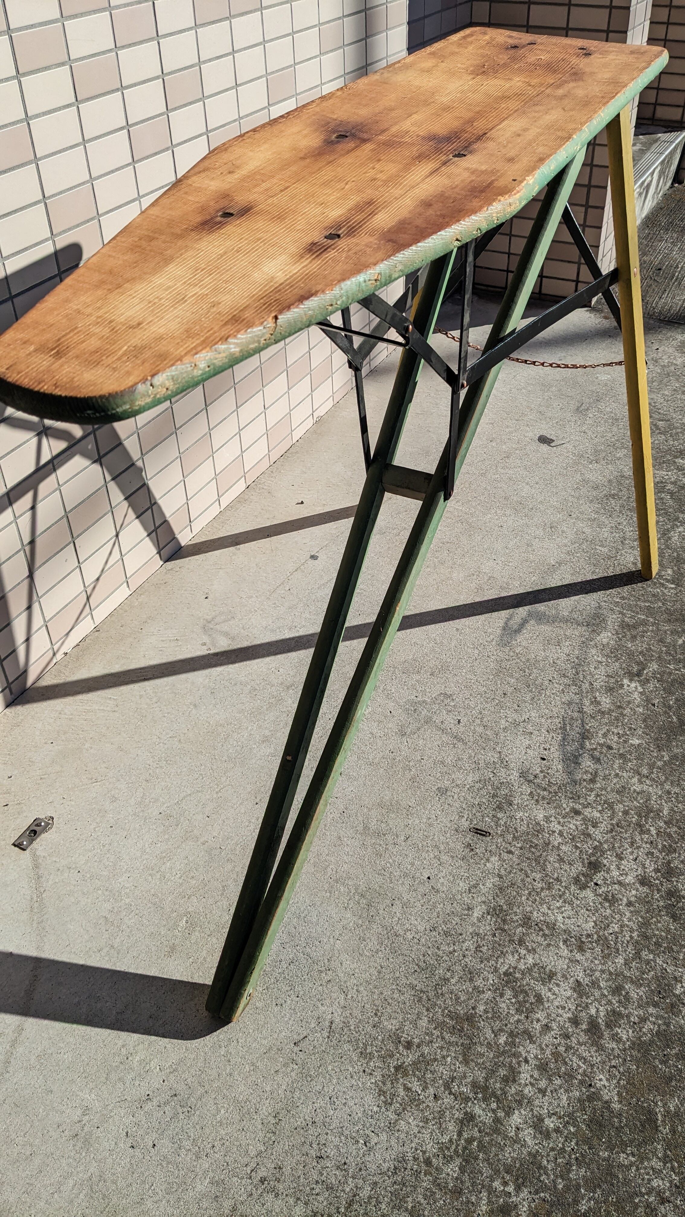 古い木製の折り畳みアイロン台で、見た目の雰囲気も抜群で、