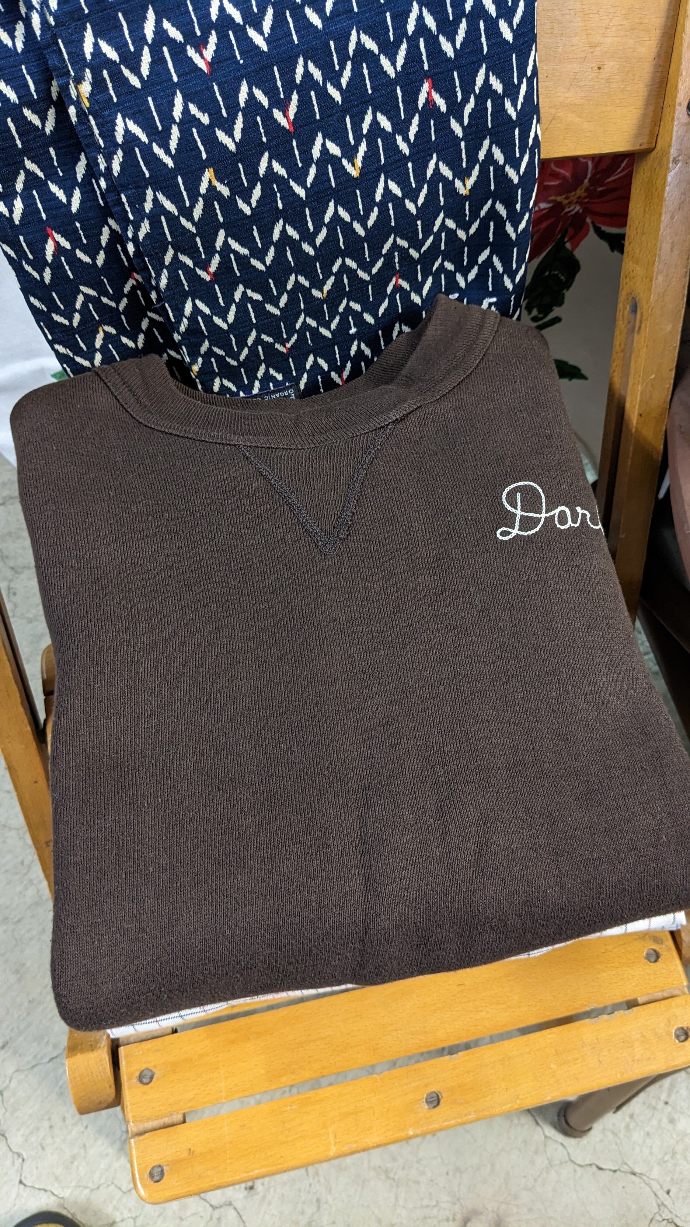変わり種のブラウンボディに素敵な刺繍の入ったヴィンテージトレーナー。