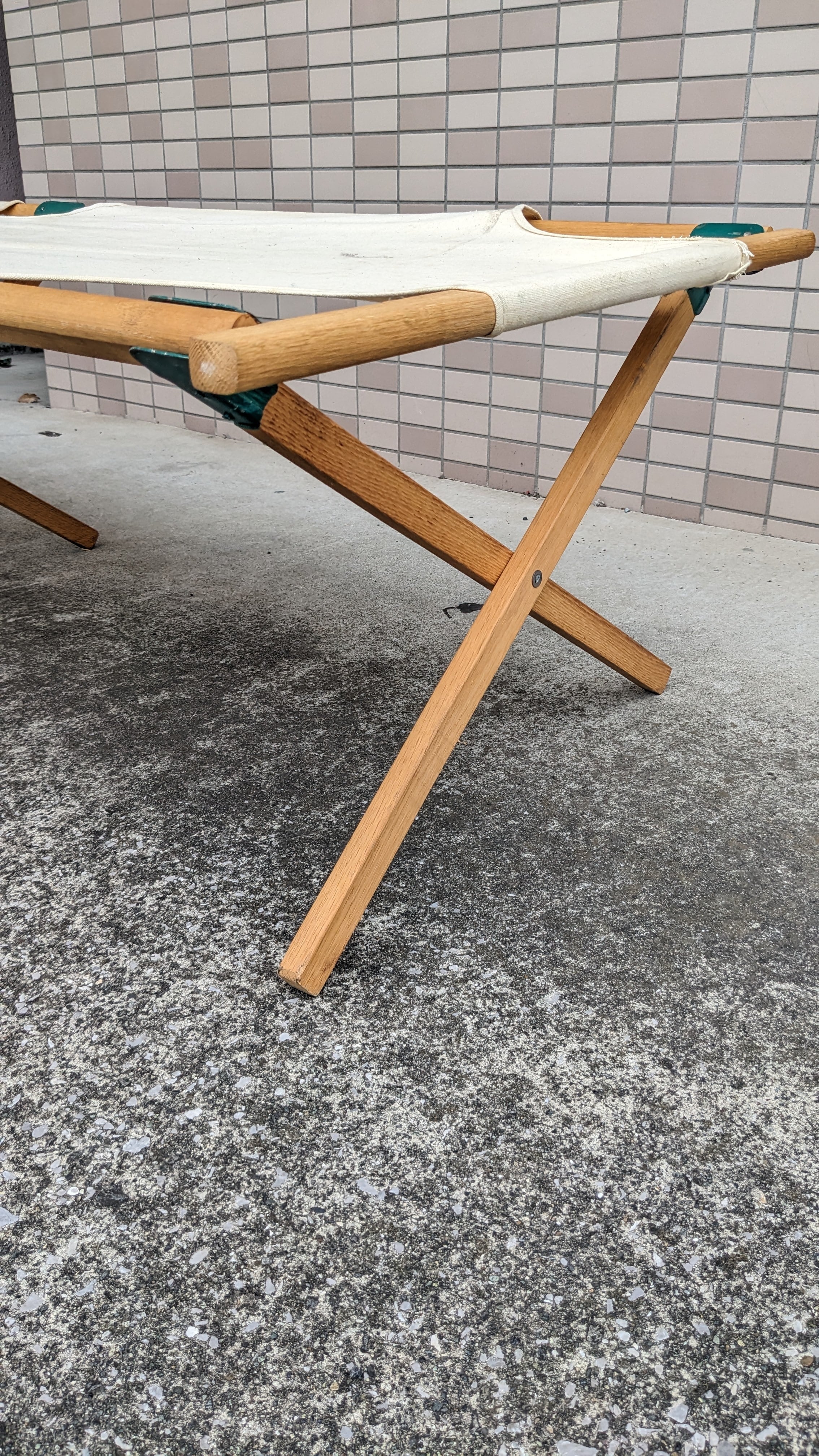 古い木製の折り畳みコットで、見た目の雰囲気も抜群で、