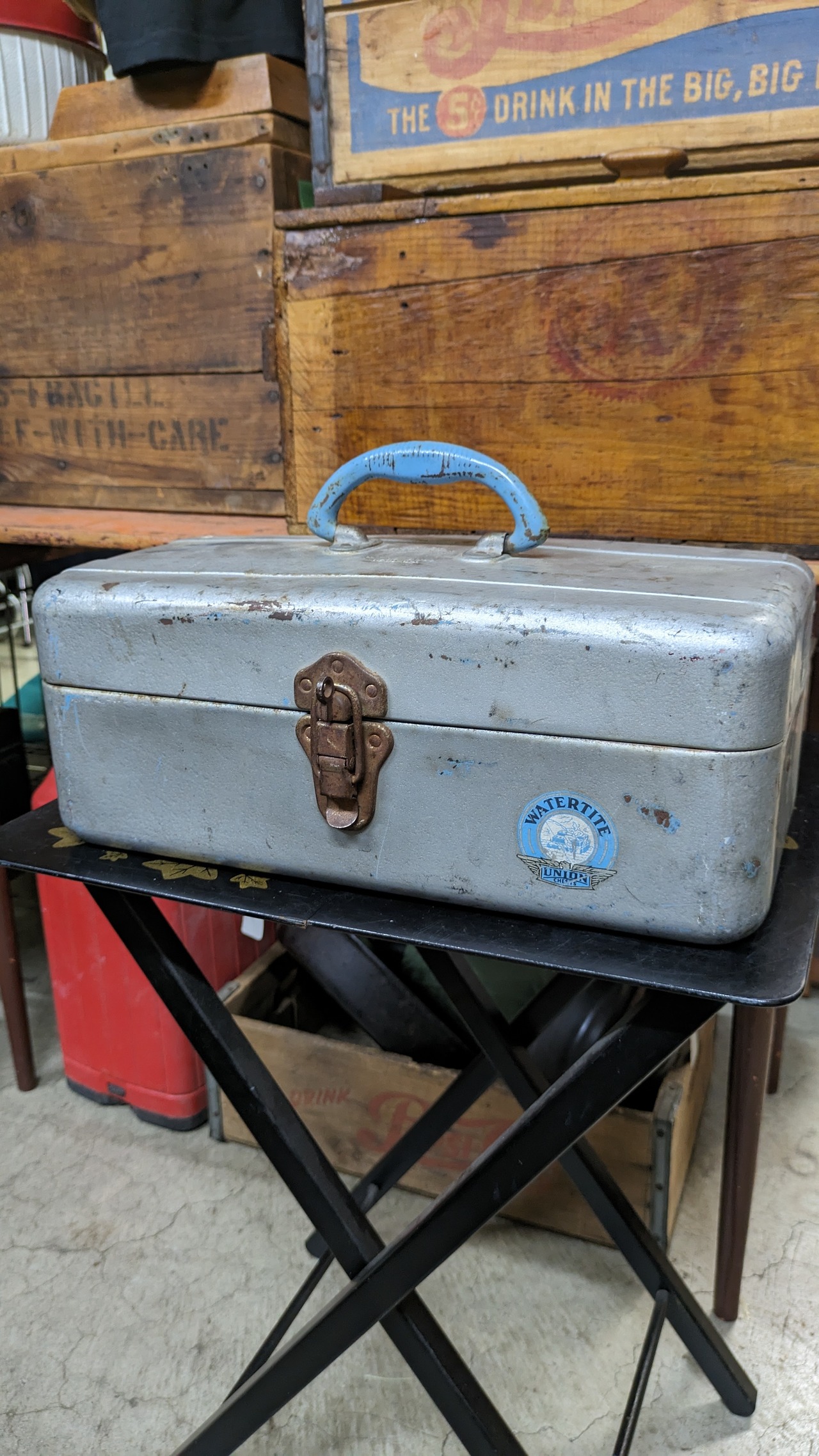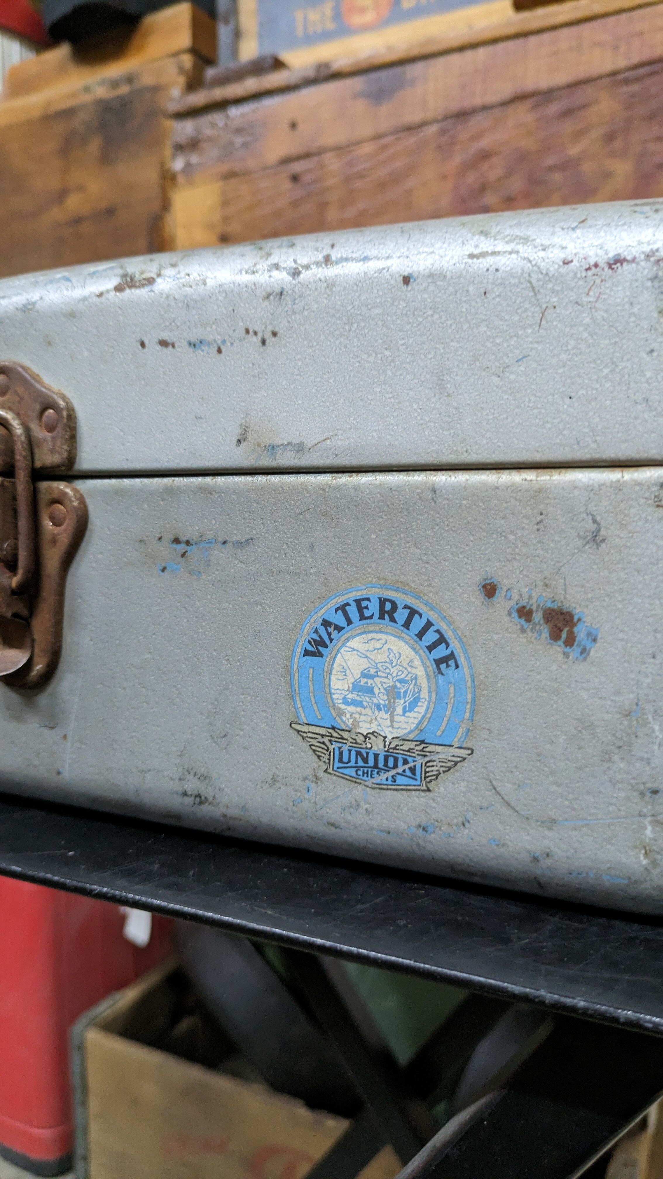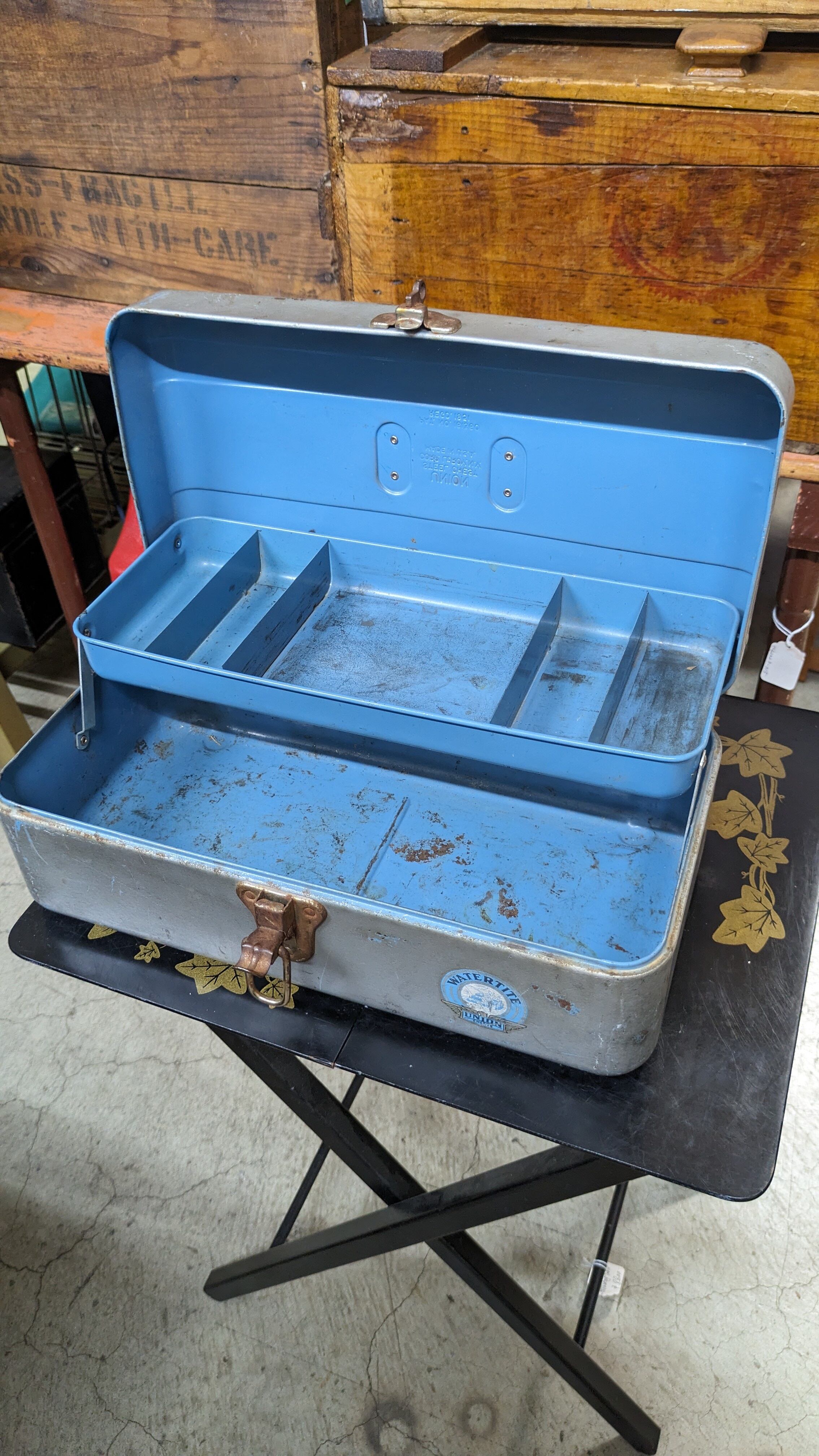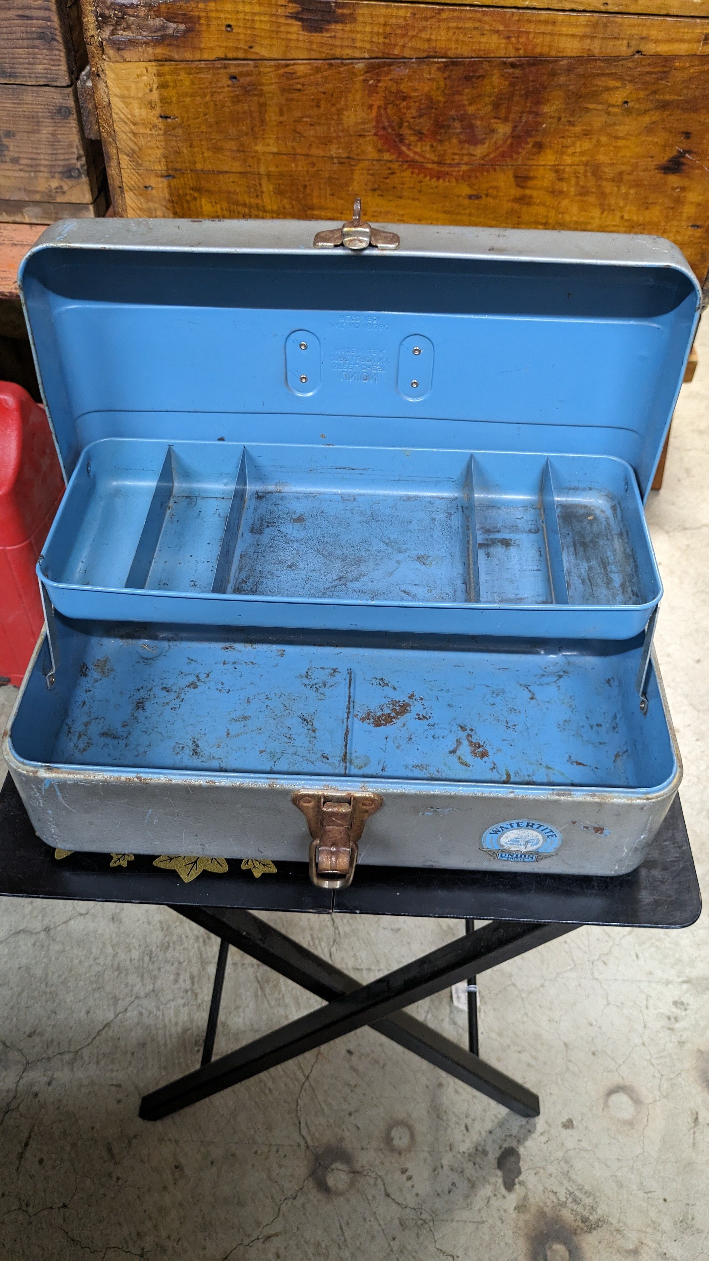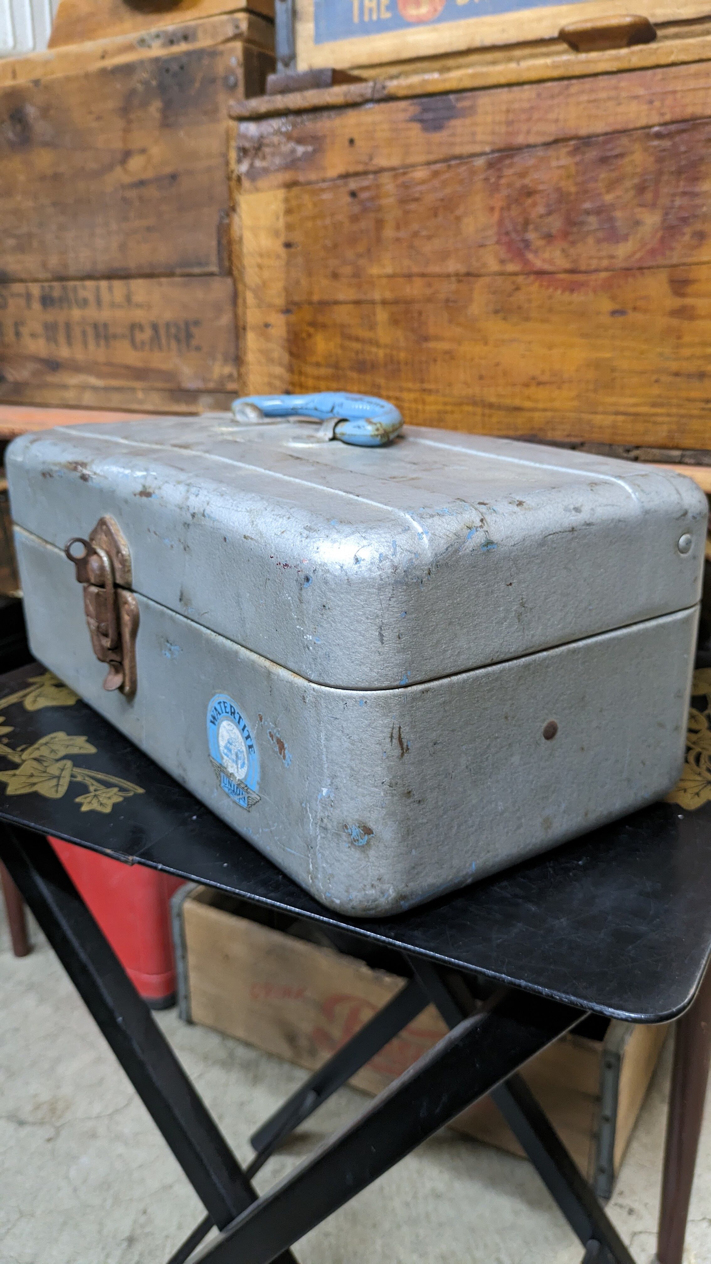 1950's Vintage UNION Chest WATERTITE ToolBox PartsBox Steel Fishiing Tackle USA ビンテージ ユニオン ツールボックス 道具入れ ギアボックス キャンプギア USA ヴィンテージキャンプ