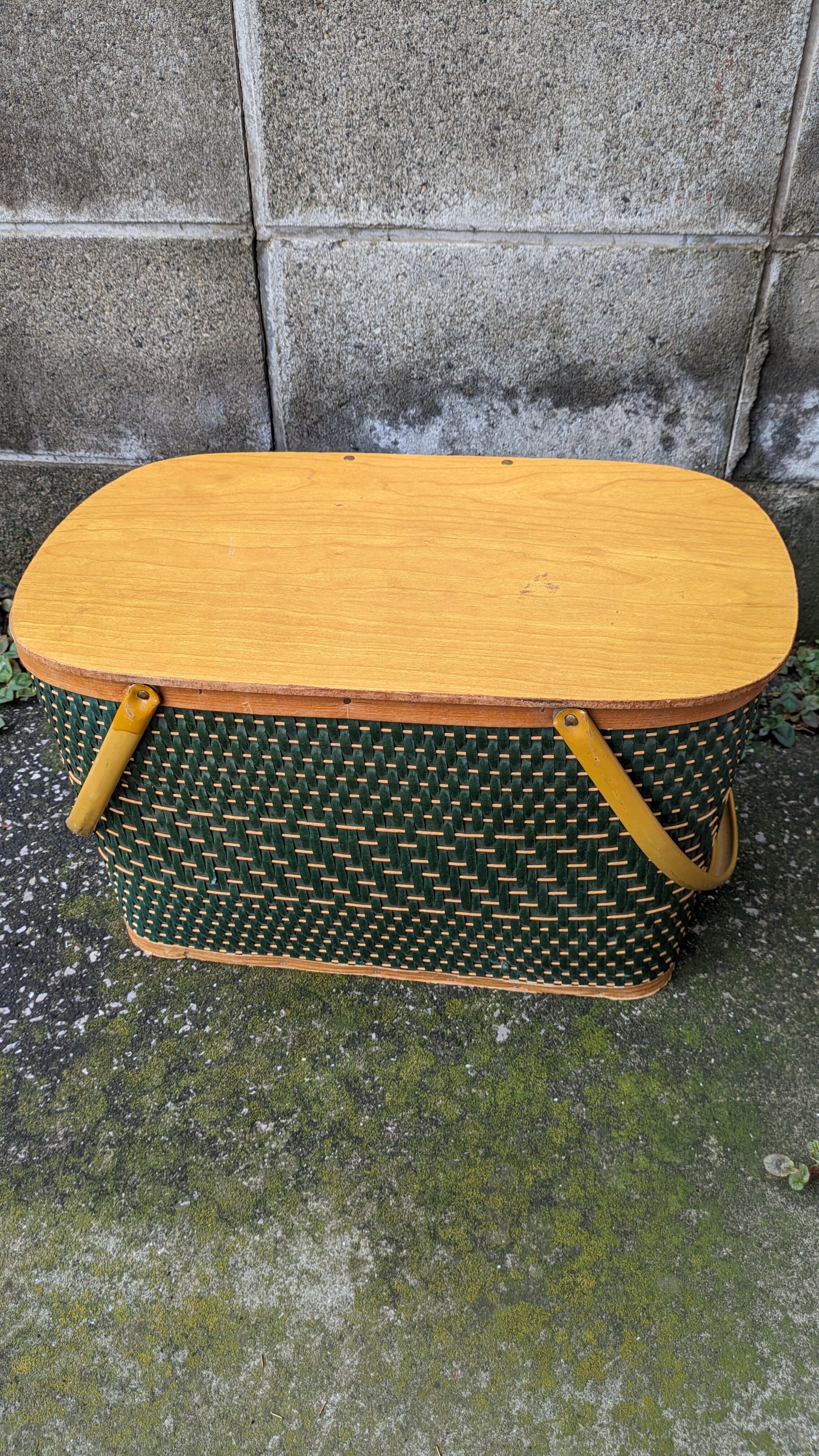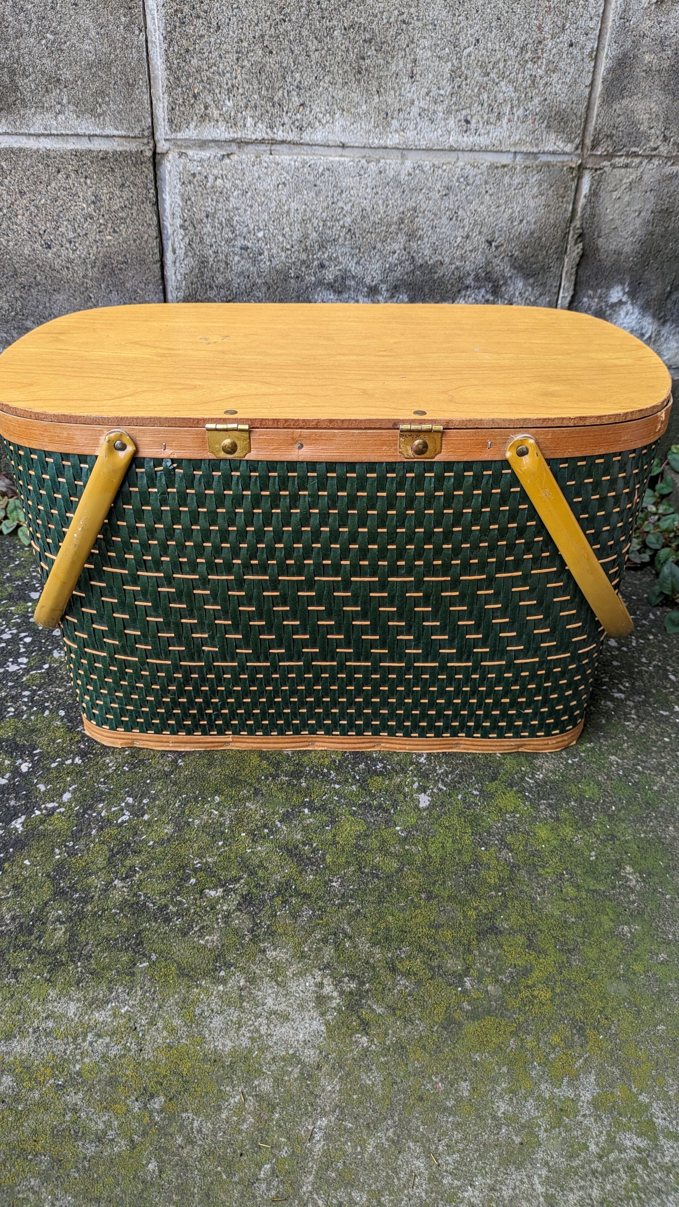 Vintage PicnicBasket Green VintageCamping ビンテージ ピクニックバスケット 緑 キャンプギア バスケット USA グリーン系 木目 バーリントン社