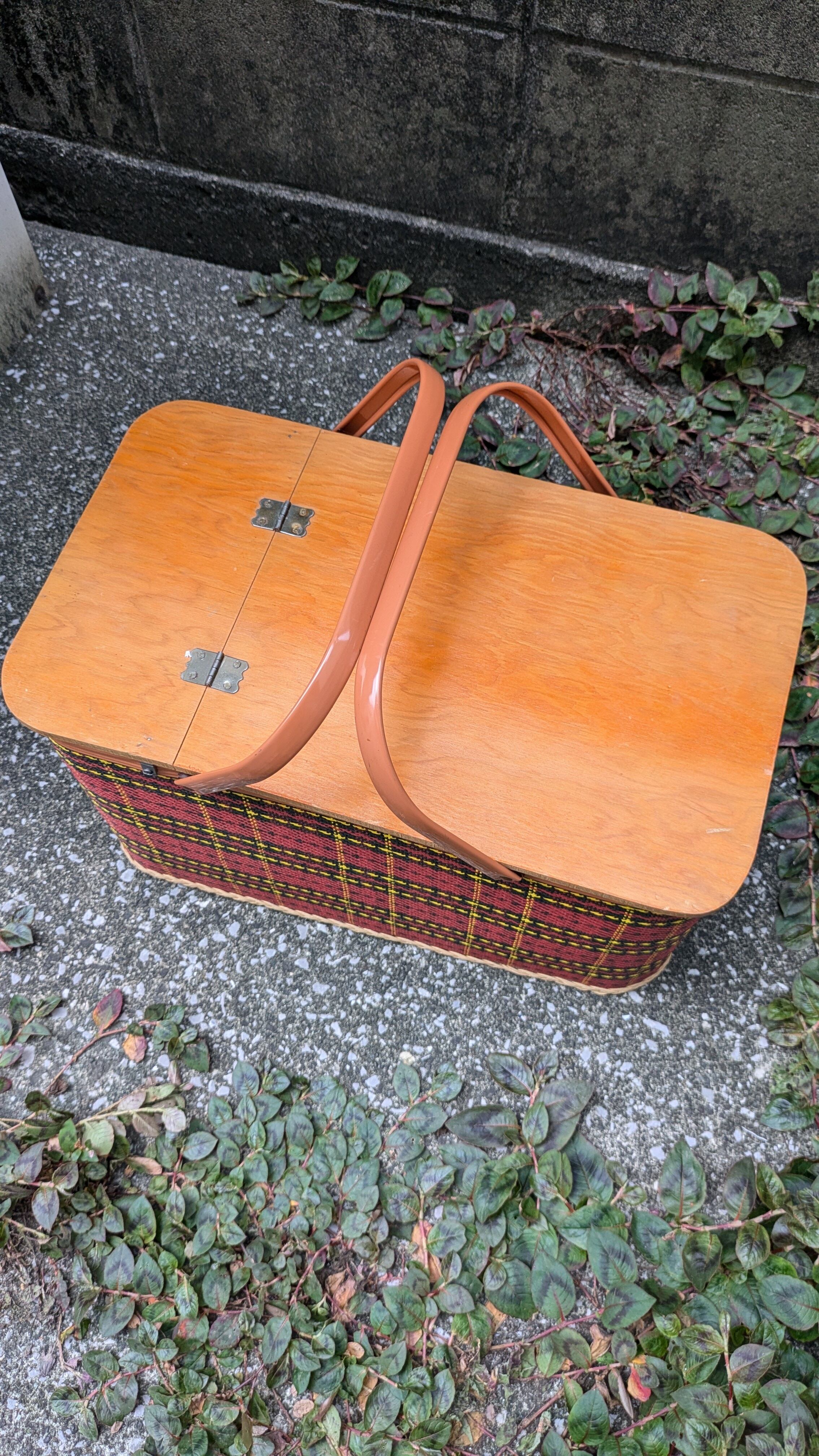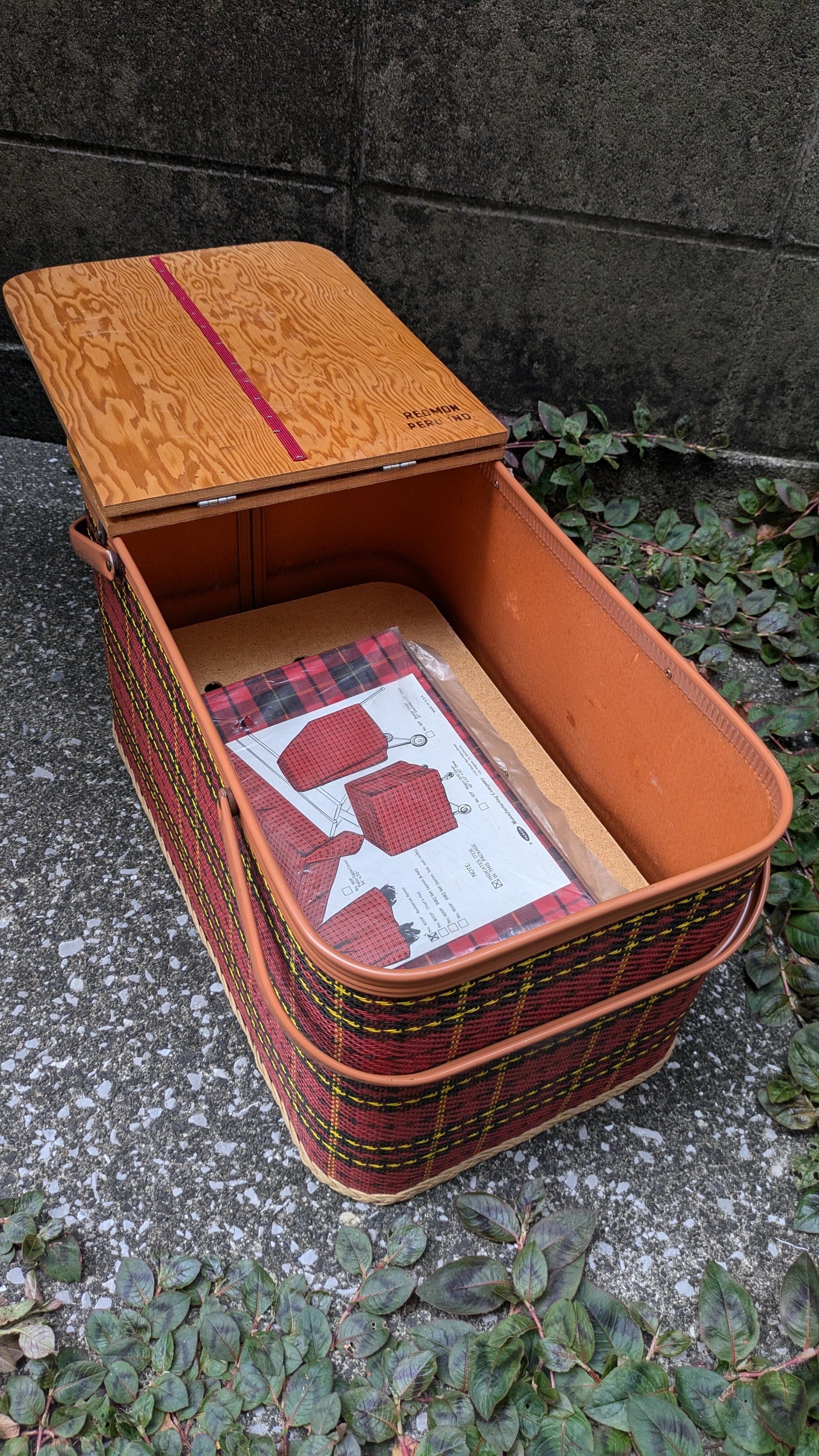 MINT!! Vintage REDMON PicnicBasket Plaid Red OldCampingStyle ビンテージ ピクニックバスケット キャンプギア バスケット チェック柄 アメリカ製 中敷き付き ランチョンマット付き