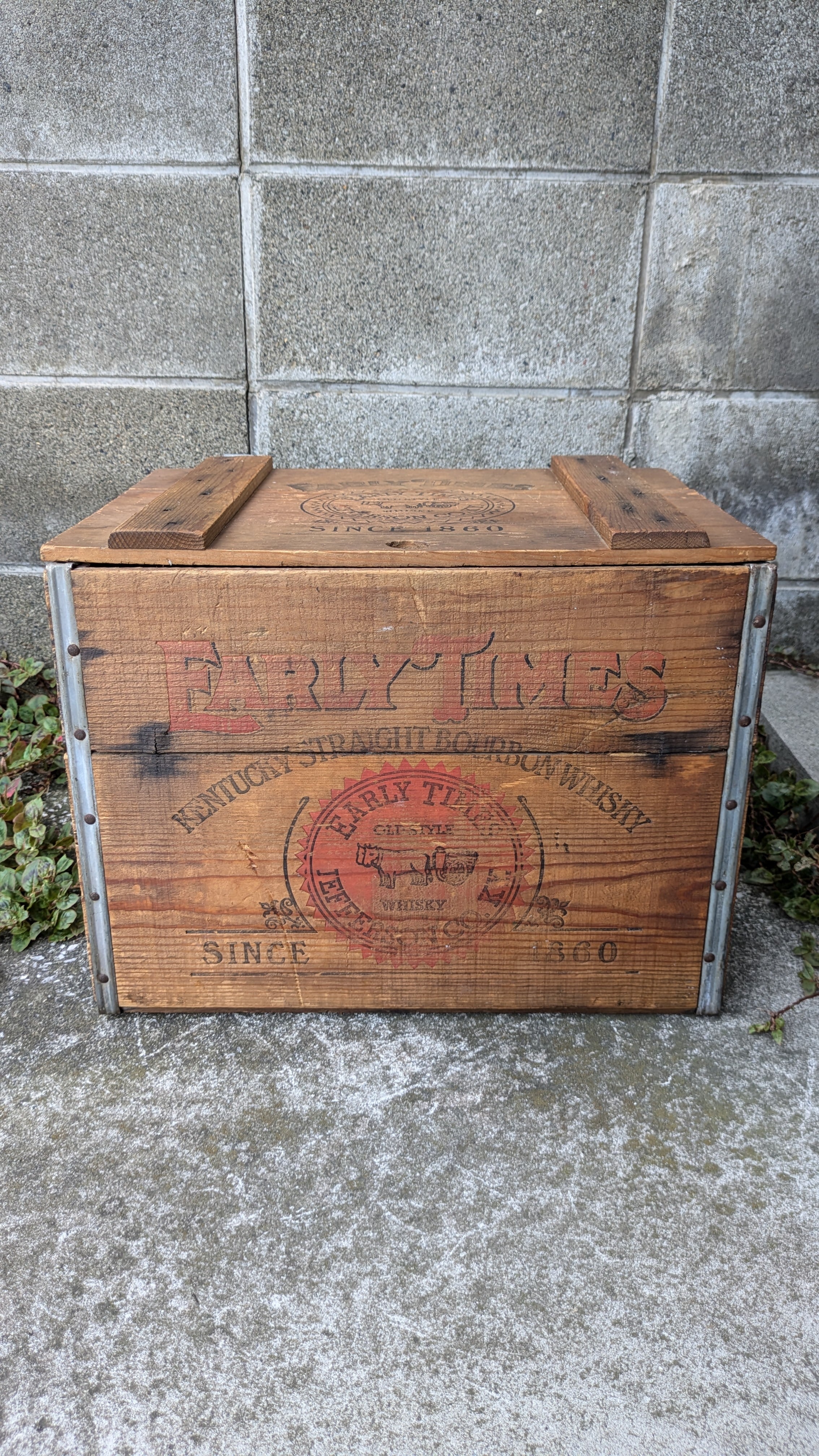 Vintage EARLYTIMES Crate WoodBox ビンテージ アーリータイムズ ウッドボックス 木製 木箱 収納ボックス ギアボックス キャンプギア クレート アンティーク ヴィンテージボックス 天板付き USA