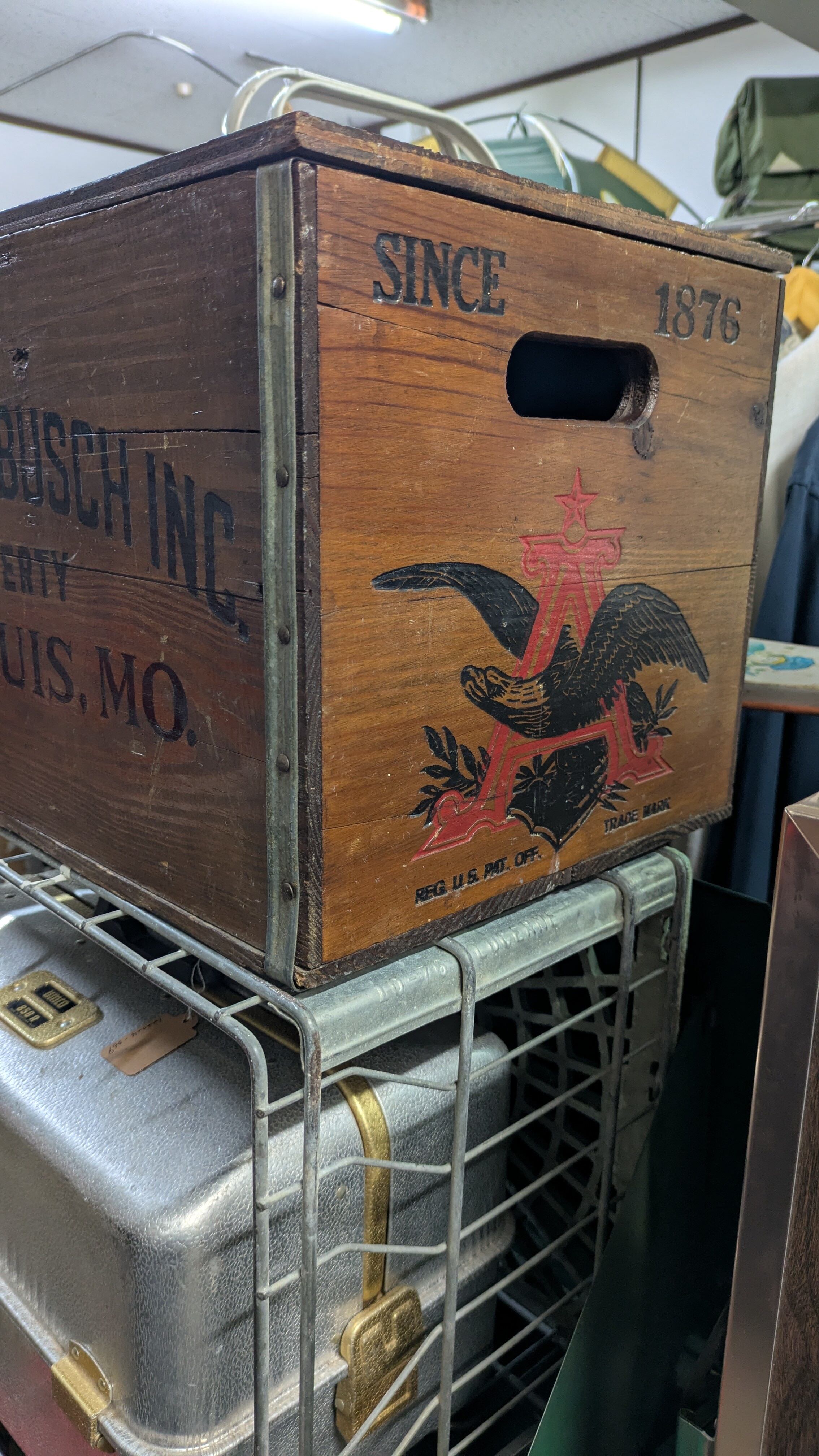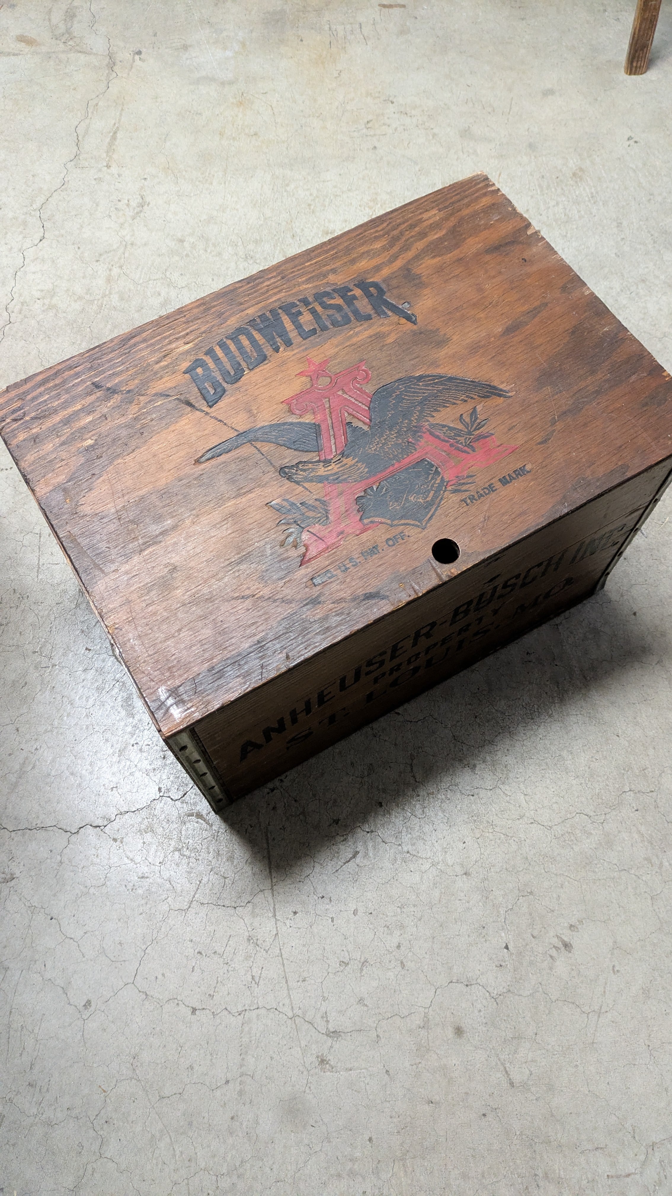Vintage Budweiser Crate WoodBox ANHEUSER BUSCH INC Checkers ビンテージ バドワイザー ウッドボックス 木製 木箱 収納ボックス ギアボックス キャンプギア クレート アンティーク ヴィンテージボックス 天板付き USA