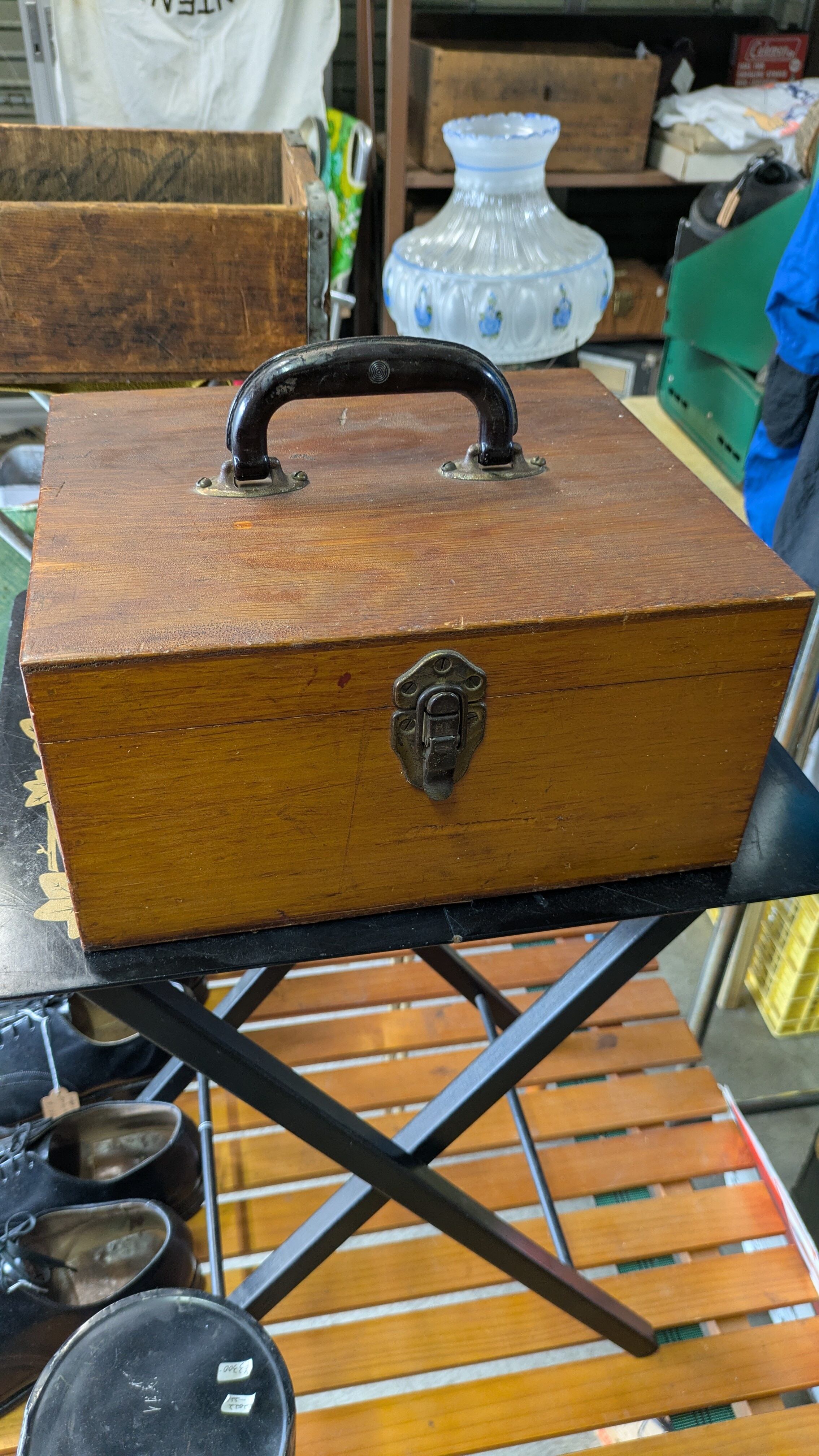 雰囲気のいい木製の一品で、古いハンドルを付けたツールボックス、